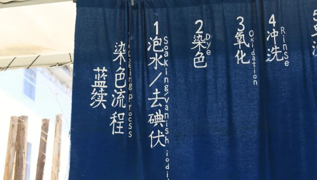 在藍續,扎染布匹隨風而舞,陽光透過枝杈灑下斑斕光影,提供古法扎染的制作與體驗。 白族扎染技藝,經國務院批準列入第一批國家級非物質文化遺產名錄。