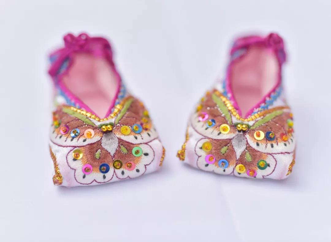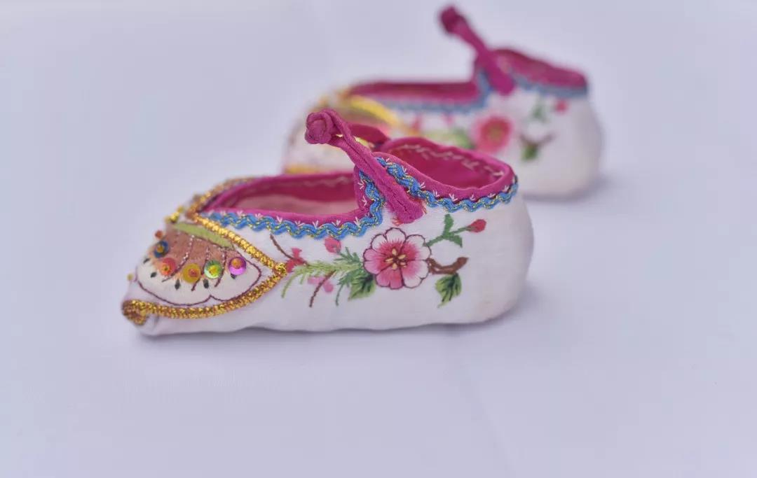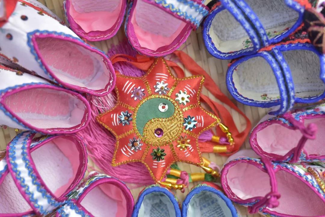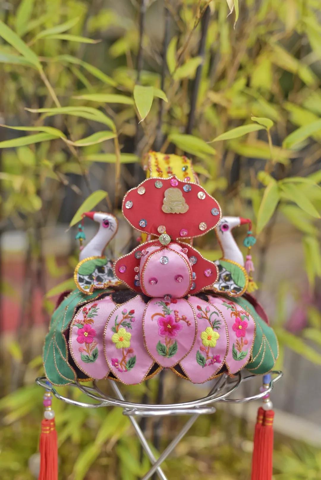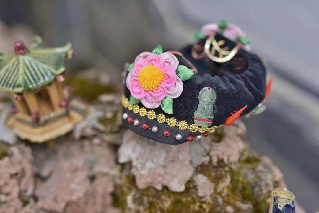 小有小的精妙,大有大的學問。除了小掛件精細別致,趙新妹做的大件帽子、嬰兒鞋也十分精美。純手工的布扎嬰兒帽將布扎與刺繡工藝結合,變換出蓮花、虎頭、狗頭等不同的形狀,再在帽子上裝飾諸如古玉、珠寶等配件,做工十分講究。趙新妹說,一頂帽子要用四五十天才能縫制好,用心程度可想而知。