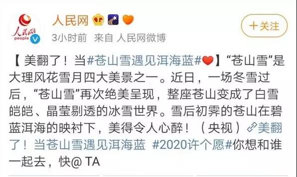 人民網的微博也讀懂了這一點,它說:“2020許個愿,當蒼山雪遇上洱海藍,你最想和誰一起去!”