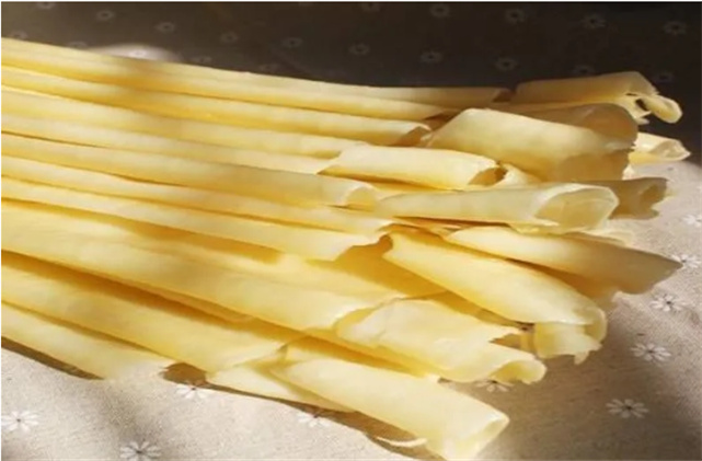 乳扇是以優質鮮牛奶為原料,混合三比一的食用酸漿加熱煉制凝結,制為薄片,纏繞于細竿上晾干而成,因狀如折扇而得名。乳扇營養價值高、醇香可口,吃法也是各式各樣,生吃、干吃、油炸、煎烤,還可以做成甜點。生吃:如果是剛制作好不久的新鮮乳扇,可以不做任何加工,直接生吃,味道油而不膩,鮮醇清香,原汁原味,還不上火。
