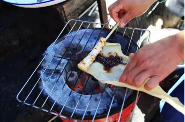 烤的過程中將乳扇平鋪成塊狀,用木棍掛住被烤軟的部分,依口味涂上煉乳或者玫瑰醬,邊卷邊烤,最后卷成筒狀。烤好的乳扇趁熱咬上一口,口感像軟軟的芝士,稍冷卻后的烤乳扇嚼起來多了幾分韌勁,奶的清香與玫瑰醬的清甜在舌尖上碰撞,耐人尋味。