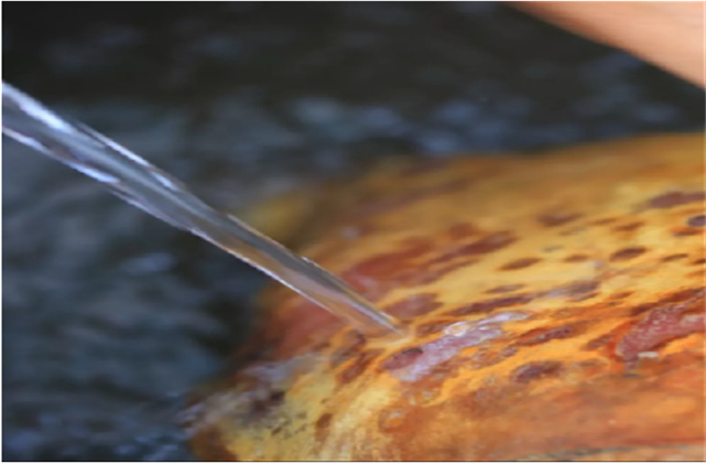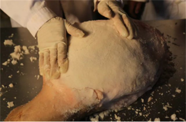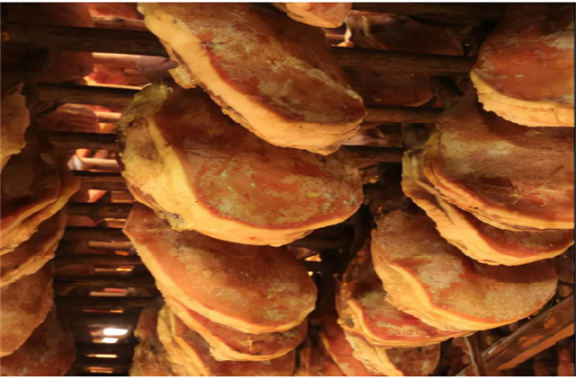 諾鄧火腿制作技藝主要包括選料、修割定形、晾干除水、排血、灑酒除菌、拍壓上鹽、腌制、上鹽泥、發(fā)酵、風(fēng)干等程序。