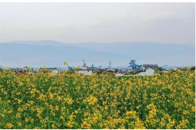在彌渡,油菜花田迎來了一年中最為燦爛奪目的時候。大片大片的黃花,在太陽的照耀下,亮閃閃、金燦燦的,甚為光彩奪目。黃的花、綠的葉,相搭互配,與藍天、白云、村莊、田壟一道,構成一道亮麗的風景線。