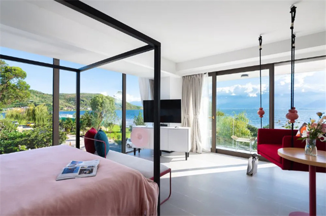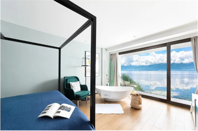 采用大面積全透明玻璃落地窗,酒店的海景客房仿佛都自帶一片海,蒼洱美景最大限度地呈現在房間內,高可賞連綿巍峨的蒼山,低可享瀲滟靜謐的洱海。