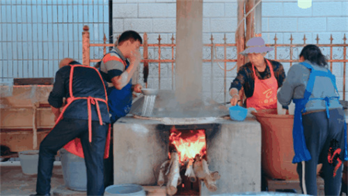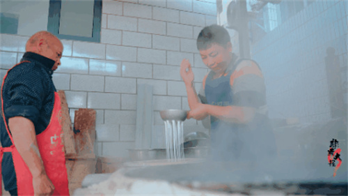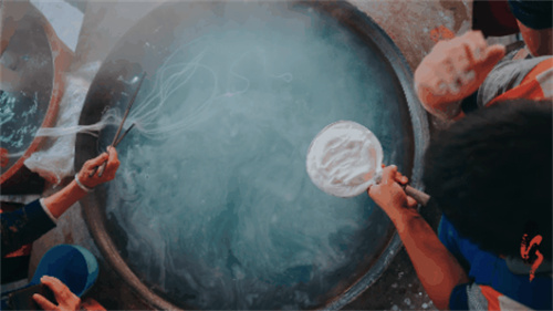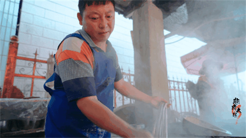 一家人齊上陣,默契的構(gòu)建了一條流水線。兩翁婿打頭陣,把粉團(tuán)放在特制的漏勺上,利用手背的力量不停擊打,淀粉則順勢(shì)而下,到熱水里定型為絲狀。