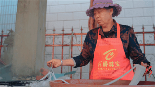 妻子這里是最后一站,她將粉絲切斷,清洗之后晾曬,這時(shí)的粉絲屬于將透未透的狀態(tài),韌性十足、晶瑩透亮,需要等待風(fēng)干,便于收藏。天氣預(yù)報(bào)是行動(dòng)指南,只有遇上好天氣,袁澤政家才會(huì)開工制作粉絲。晾干的粉絲需要泡水,目的是使其稍微回軟一些,方便包裝。