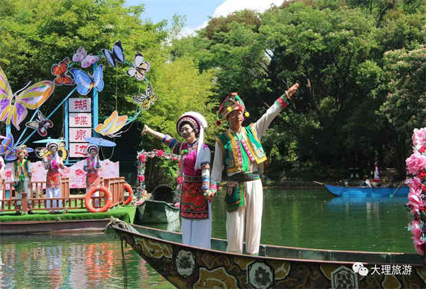 “蝴蝶泉邊·蝴蝶會”期間,在蝴蝶泉邊、情人湖邊、竹林道等位置,由景區(qū)舞蹈演員帶領游客朋友一同開展歡歌打
