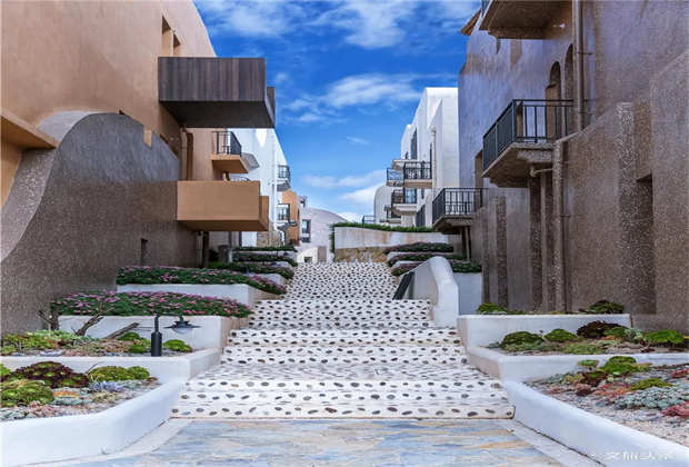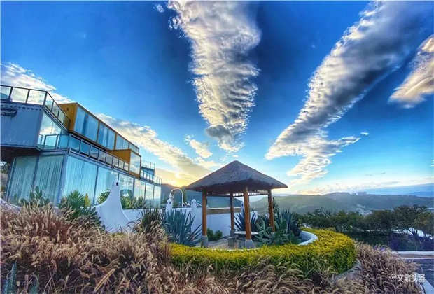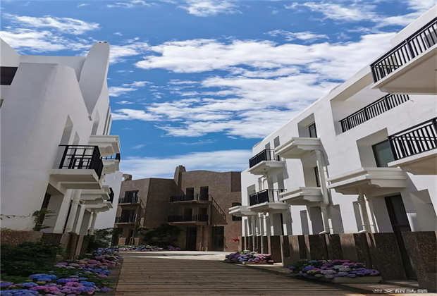 ? ? ??白色浪漫、純凈和夢幻,大地色自然、深邃,雕琢出建筑的厚重感與文化意蘊。裸露的火山石、質樸的茅草頂,搭配著自由延伸的臺階和景墻,在廣闊的藍天背景下,與蒼山洱海融為一體,仿佛一座童話王國。