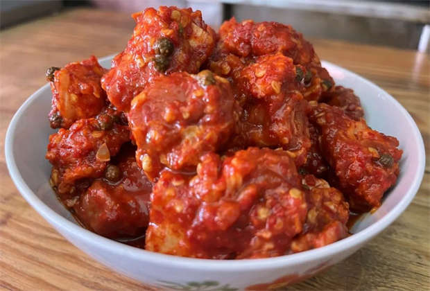 ? ? ? 雖然帶了個肝字,但卻與豬肝無關。鶴慶做豬肝酢稱為捏豬肝酢,一個捏字凸顯了關鍵。豬肝酢以豬排、豬腸、豬肚為主料,辣椒面、鹽巴、花椒粒為輔料,主、輔料拌均后,倒入乾酒和龍潭水,反復捏、拌,直到配料與主料色、味相融,呈現出紅生生的顏色,然后入罐壓實,最后在罐口封上一層豬油,存放一段時間即可食用,可存放一至二年,色、味不變,堪為神奇。