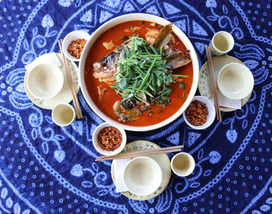 “家財萬貫不如魚湯泡飯。”在大理,幾乎家家會做酸辣魚,其味美鮮香、酸辣可口、百嘗不厭,一直以來都是白族家宴上的主角以及待客的“招牌”。大理酸辣魚以洱海鯽魚為主材,配以紅椒、青椒、木瓜、楊梅或烏梅為原料,用土灶燒柴火煮成,有時還會放入土豆和豆腐作為輔料,酸、辣、鮮、香,令人食欲大開。嘗上一口,鮮甜甘美,鮮香的魚湯用來泡飯,更是美得從胃到心里。