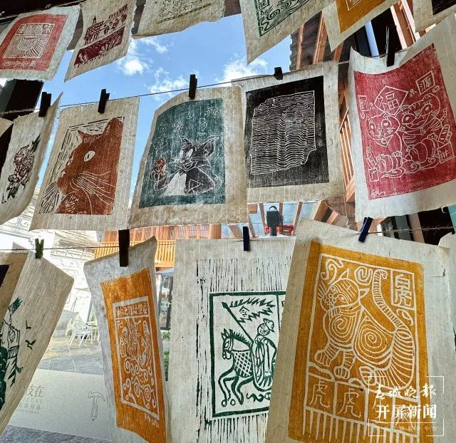 甲馬藝術館前,有一副巨大的甲馬群像,將大理地區各個村子的不同本主以甲馬版畫的藝術形式展現出來,結合了白族本主文化與省級非遺甲馬兩項民間藝術。曾經菜市場上兩三毛錢一張的甲馬,如今通過完善的傳承保護體系,實現了創造性轉化與創新性發展,在酒吧、民宿、文創產品中隨處可見,成為裝點生活的時尚元素,成了外來游客關于“大理印象”的重要視覺元素,也是了解大理民間智慧與美學的窗口,廣受年輕人追捧。
