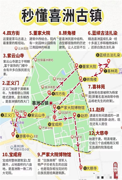 正義門--紫云寺--四方街--董家大院--藍續古法扎染--喜林苑--轉角樓--嚴家大院博物館--寶成府--趙府--大慈寺