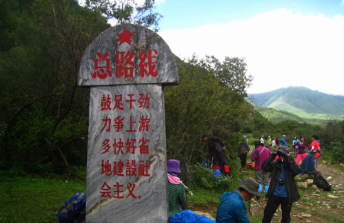 第一天20公里,喜洲文革村山口開始徒步,約1.5小時到達埡口,埡口邊有些工棚,有山泉水,可在此休息,埡口過有個岔路口,右邊是修好的土工路,請往左邊的山路走,約4小時可到達社會主義總路線路碑,之后3小時是平坦的大花甸地區,順著已經沖毀的公路痕跡一直往前走,7小時左右到花甸壩藥材場,記得是過一個小橋,有村莊感覺的地方,因為房子實在太少,所以不要走過了.
