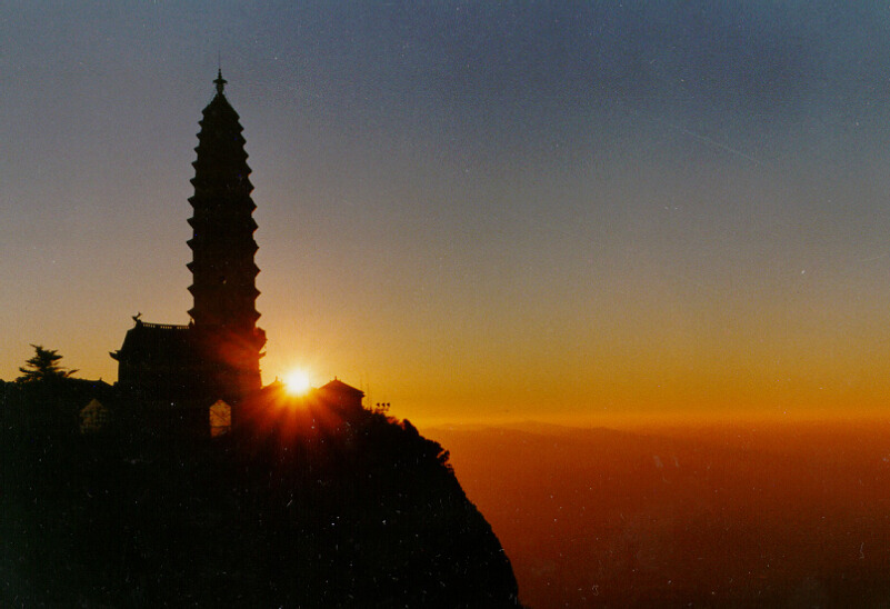 金頂寺。后來多數(shù)寺宇被毀,現(xiàn)僅存清代的祝圣寺、金頂寺大門和楞嚴(yán)塔。山間云霧縹緲,溪水琮琮,為中國佛教名山之一。