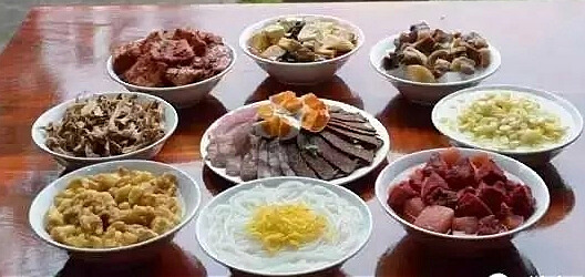 傳統(tǒng)的葷席八大碗,即紅肉、酥肉、粉蒸肉、千張肉、茶豆子、粉絲、木耳、豆腐皮春卷、百合加一個涼菜拼盤。