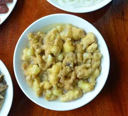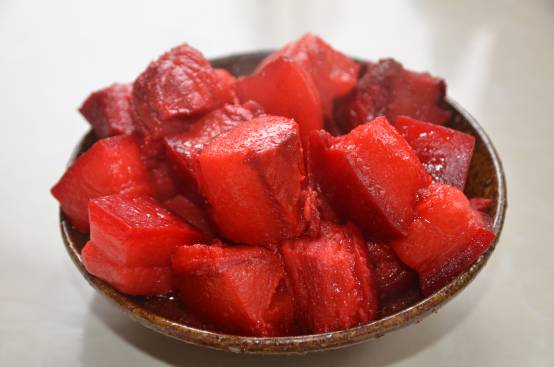 杉陽“土八碗”中的老大——紅肉,喜慶筵席上絕對少不了它的。美女們看著先別害怕,這四四方方紅得晶瑩透亮的肉肉,也許你吃了第一塊,還想吃第二塊。整桌菜品中,最代表喜慶的就是這碗用腿子肉做成的紅肉兒,肥肉多瘦肉少。可想而知,在那個葷腥大就代表生活水平高的年代,這道用紅色礦物質(zhì)“膏子”(俗稱“大紅”)點出來血紅油亮、大塊方正的豬肉讓人如何充滿食欲,吃起來又是如何過癮、滿足。