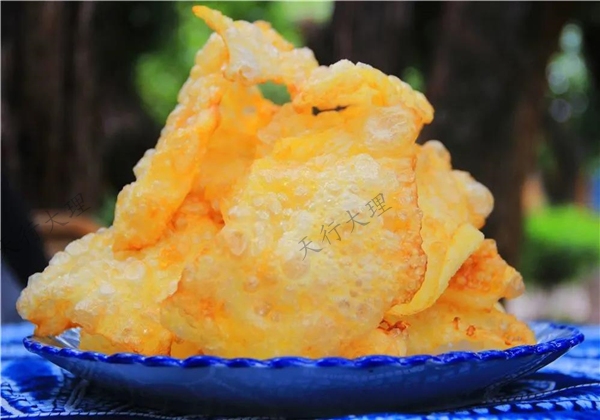 很多大理人,尤其是許多沿洱海而居的大理人,一定吃過炸魚鱗這道菜。利用魚鱗與鹽、花椒面等均勻攪拌后煎炸出來的魚鱗,金黃酥脆,而且還可以補鈣,營養價值頗高。
