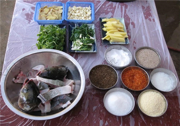 以酸精(檸檬精)、紅辣椒面、青蒜苗、草果粉、洋芋等為主要原料,海稍魚采用獨特的烹飪技藝加工而成。