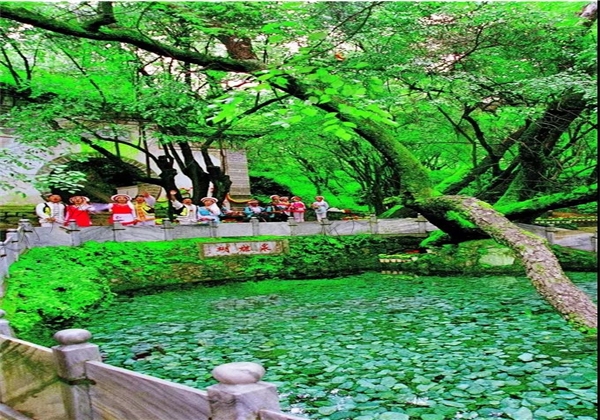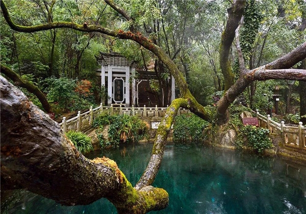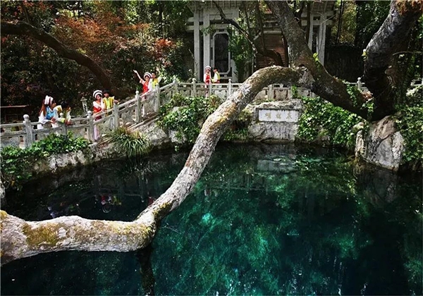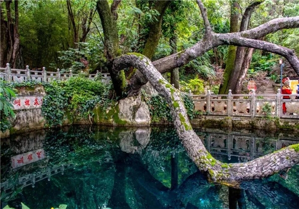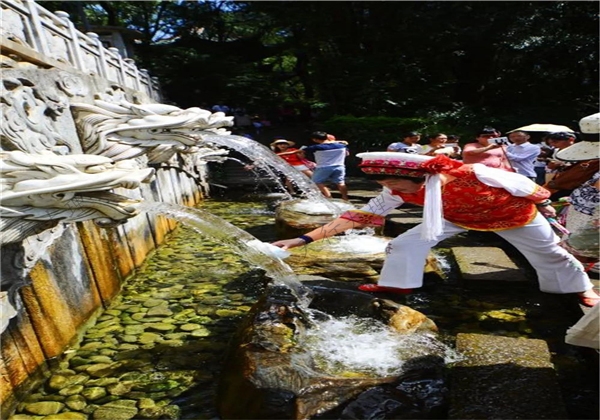 蝴蝶泉的下方是“五龍池”。五龍池的水,被視作忠貞愛(ài)情的象征;在“五龍吐水”的龍頭下洗手,可把幸福、吉祥帶回家。