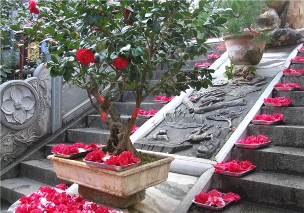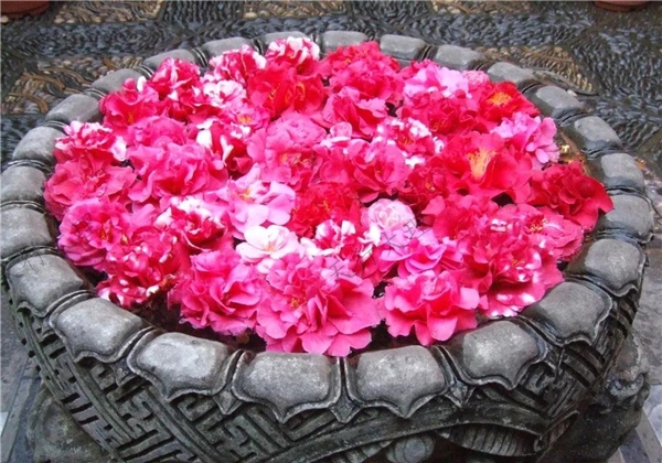還有飄在水中的茶花,仿佛水也是紅的,一盆盆一缸缸艷美,不像在腳下,倒像在心底,看久了心事都會看化。按張家花園的傳統,飄過三天,那些茶花就會變成花肥,綻放在次年春天枝頭,而這一季的盛放中,仍有上一年的落紅藏底,如此落落開開,年復一年。