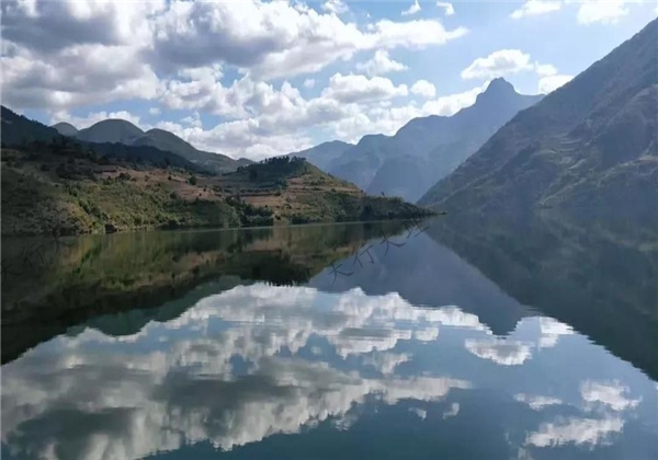 我們乘坐的船只朝著青華方向前進,一路風光如畫,藍天白云倒影在江面上,隨手一拍都感覺要出大片,還以為是穿越到了桂林山水間。