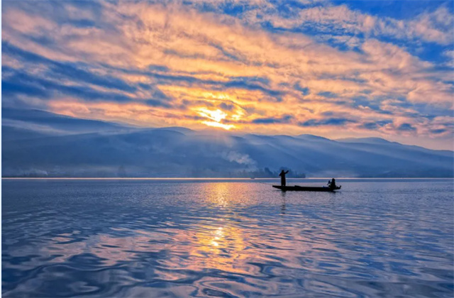 “水色清澄,漁帆點點,菰蒲掩映,頗似杭州西湖,為邊地勝景?!?劍湖形似“大元寶”,堪稱鑲嵌于滇西北高原上的璀璨明珠。初秋,湖面碧波蕩漾,水鳥嬉戲,一派勃勃生機(jī),偶有悠揚漁歌久久回蕩。