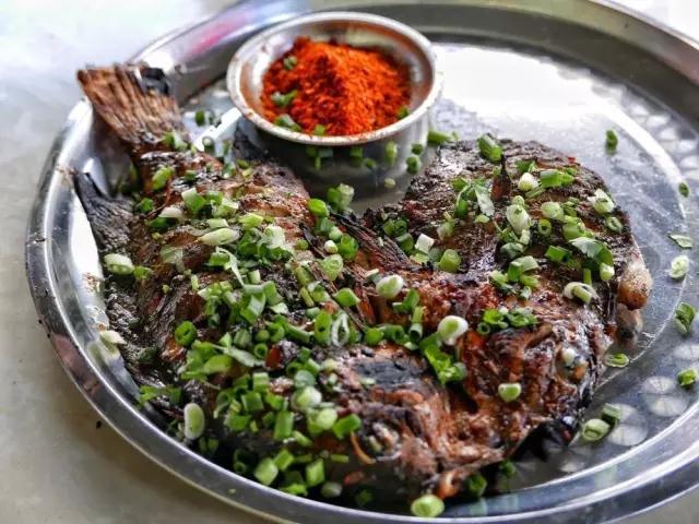 烤好的魚上面撒上蔥花,再配一碟辣椒粉,坐在海邊別有一番風味。