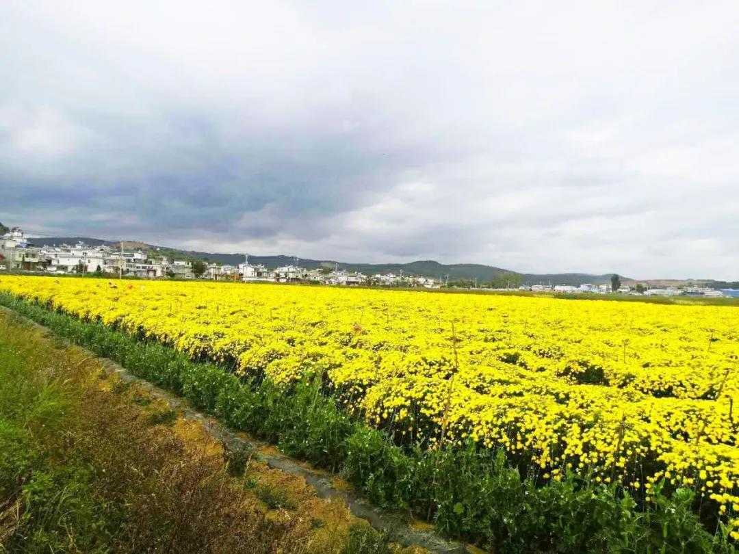 秋菊有佳色,裛露掇其英。古時便有陶淵明采菊為食的例子,如今大理的黃菊也迎著秋風盛放。陽光穿過薄霧,滿山滿地都是璀璨的花朵。花兒幾朵為一簇,一根莖蔓上有無數個一簇。莖蔓相纏,編織出一片黃色的云霧。黃菊淡淡的藥香在空氣里徘徊,解除了在秋日中勞作的人們的疲憊之感。