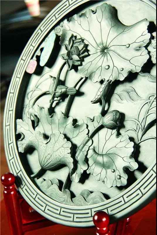 微雕后再進行精細打磨,清洗,放入本地產的食用菜籽油浸泡2-3天后拿出,海綿擦拭干凈,一方質材、做工上好的鳳羽硯算是制作完成了,配以木質底座,裝入盒子后,便可作為成品出售。