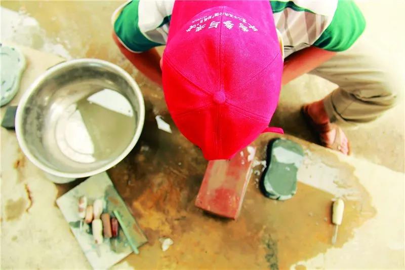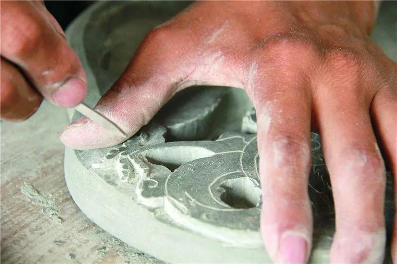 “辨別石材優劣,全憑長年累月積累下來的眼力和手感。‘選材的方法簡稱為一澆、二敲、三看。’”張躍堂介紹,所謂“澆”就是往石頭上澆水,使其真實的顏色和紋理都能清楚顯現;“敲”就是用錘頭敲打石頭,看看是否會出現裂紋和細縫。“老一輩手藝人經驗豐富,石頭放到手里看一看、摸一摸,不用敲掉外層就能知道里頭的料好不好。”制作硯臺的石材質地越細膩越好,“最好的石頭摸上去像小娃娃的屁股一樣光滑”。硯石不可出現裂紋,顏色不是越深越好,以帶綠色花紋為佳。