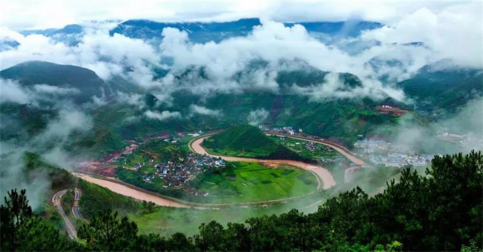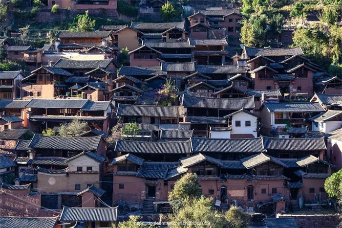 清晨,站在一處山坡往下看,崇山峻嶺間,一片屋頂在滿眼的蒼翠中露出若隱若現的輪廓,寂靜而又生動。