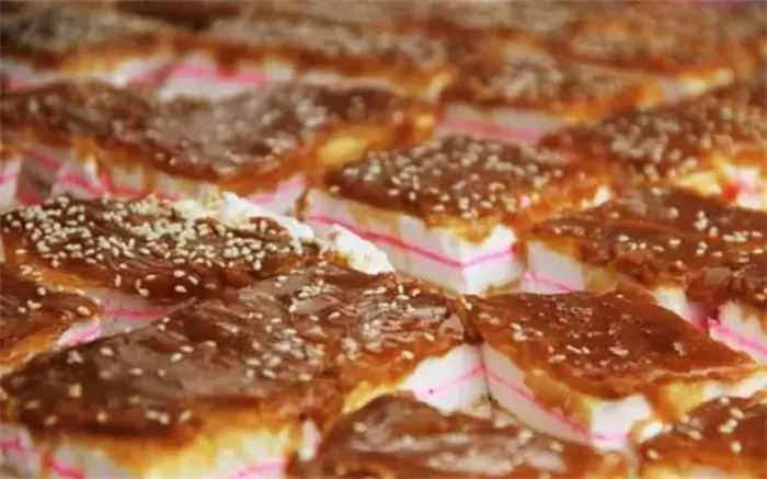 色糕呈正方形,中間有紅色腰線,表面為紅色罩面,紅白分明,質細而美觀。