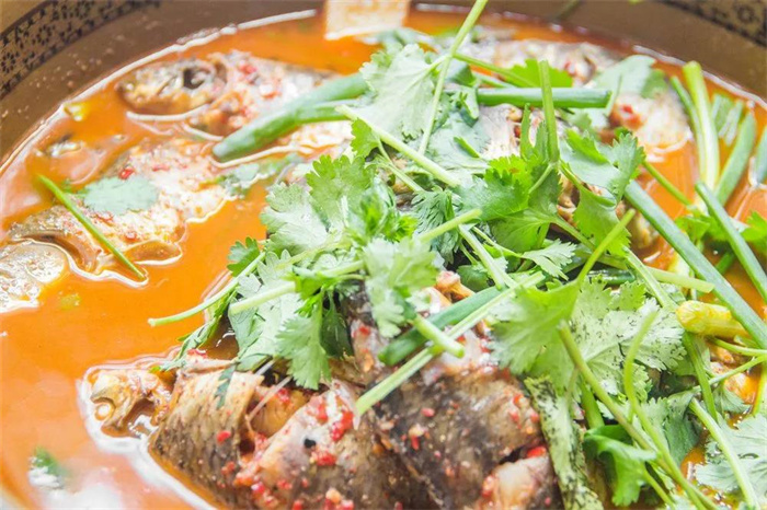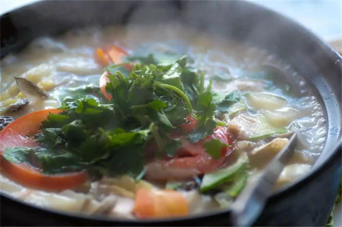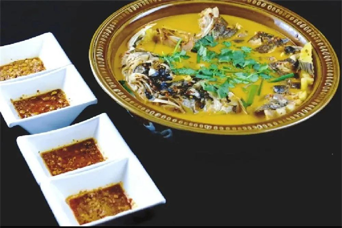 以洱海鯽魚(yú)為主材,大理酸辣魚(yú)搭配紅椒、青椒、木瓜、楊梅或?yàn)趺窞樵希垢⑼炼篂檩o料,用土灶燒柴火煮成。嘗上一口,鮮甜甘美,鮮香的魚(yú)湯用來(lái)泡飯也是一絕。