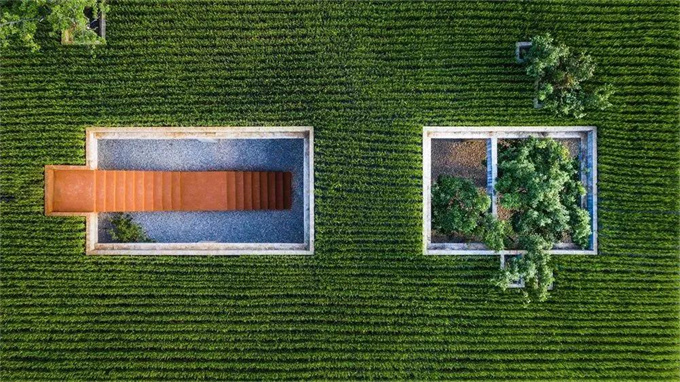 劇場與新綠的稻田融為一體